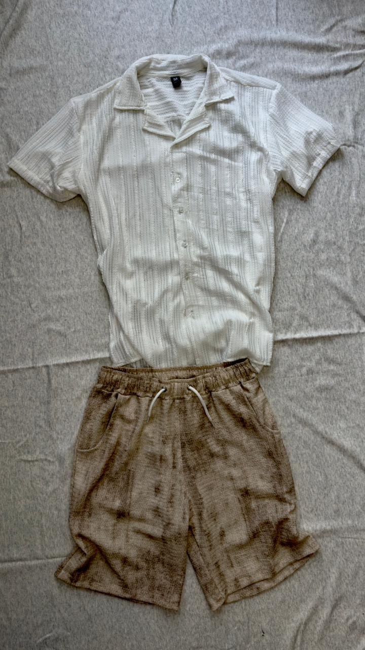 Camisa Tejida – Blanco combinada con la Bermuda Safari – Beige.